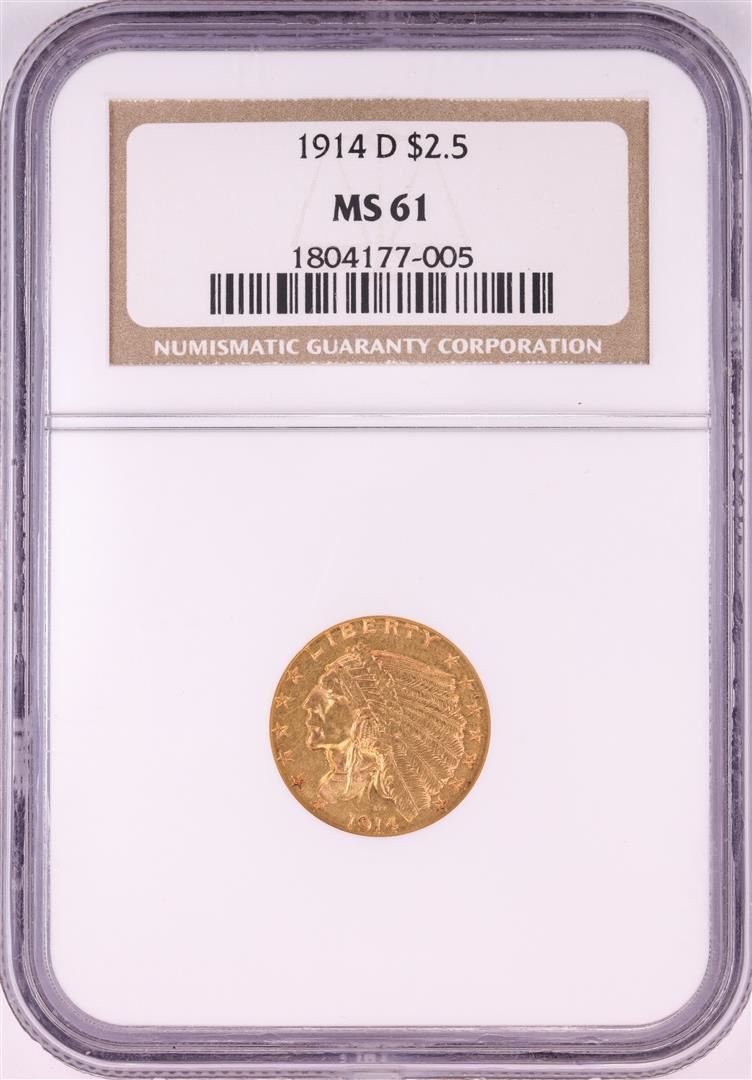 One 1914-D $2 1/2 Indian Head Quarter Eagle Gold Coin NGC MS61. NGC Certified.