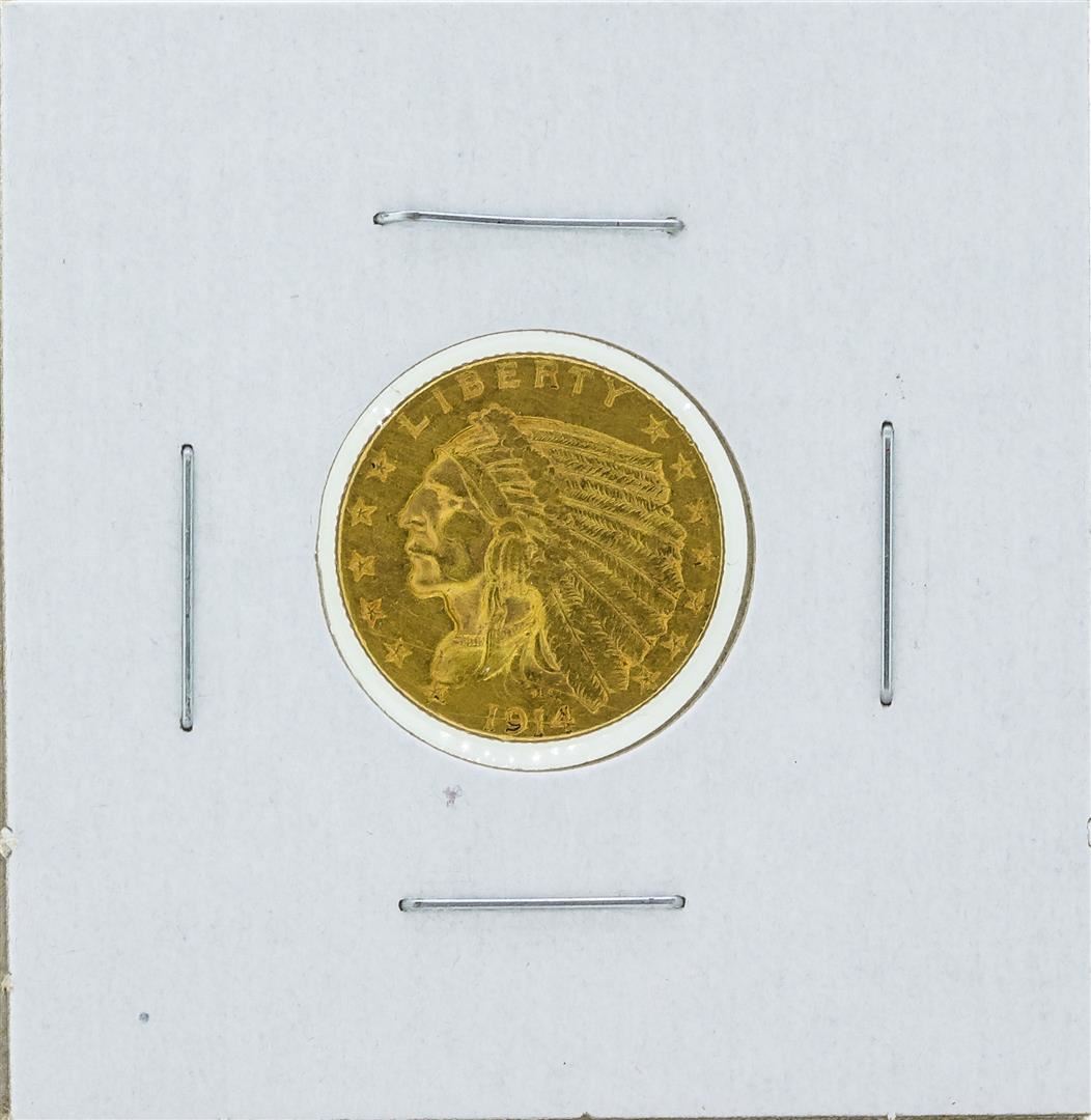 One 1914-D $2 1/2 Indian Head Quarter Eagle Gold Coin.