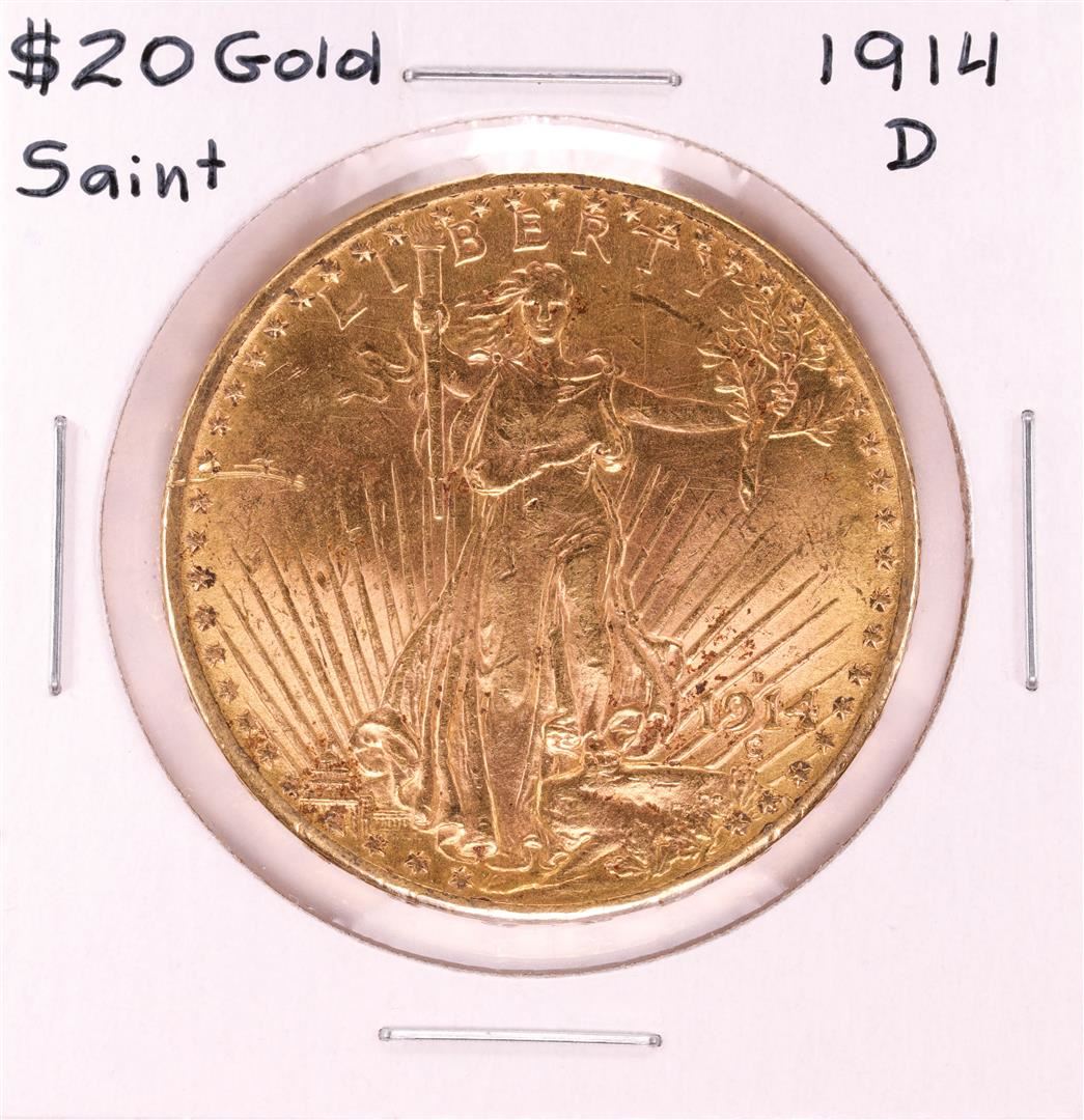 One 1914-D $20 Saint Gaudens Double Eagle Gold Coin.