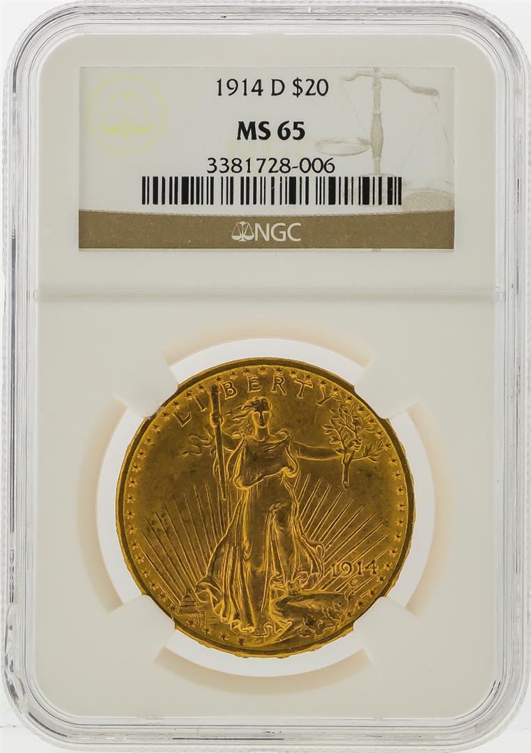 One 1914-D $20 St. Gaudens Double Eagle Gold Coin NGC MS65. NGC Certified.