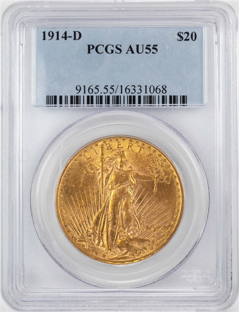 One 1914-D $20 St. Gaudens Double Eagle Gold Coin PCGS AU55. PCGS Graded.