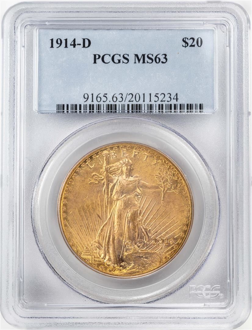 One 1914-D $20 St. Gaudens Double Eagle Gold Coin PCGS MS63. PCGS Graded.