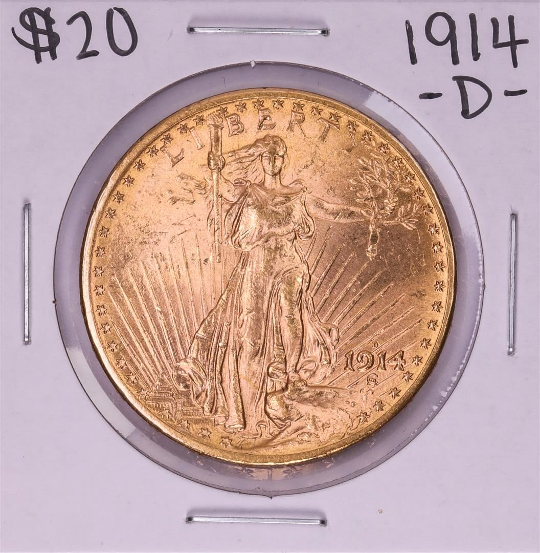 One 1914-D $20 St. Gaudens Double Eagle Gold Coin.