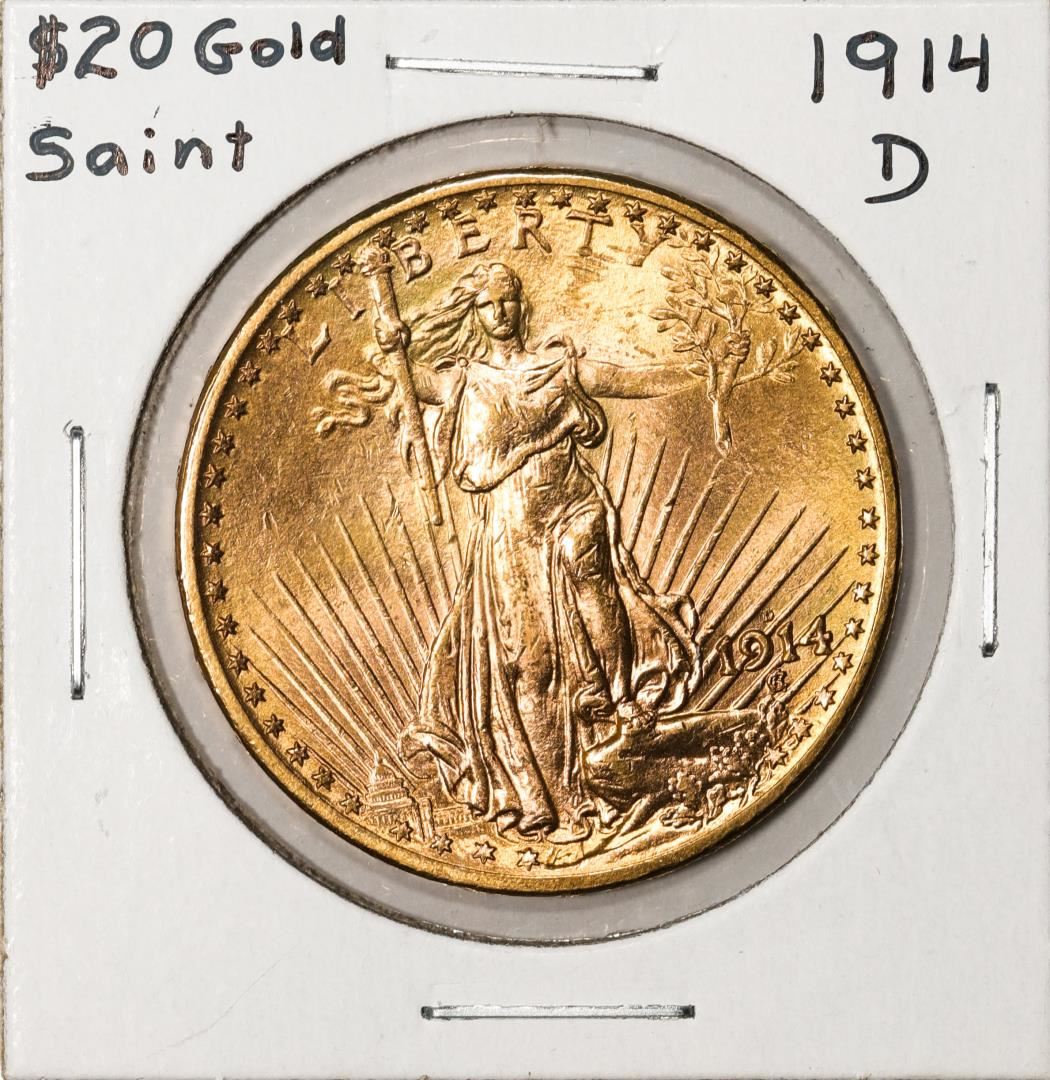 One 1914-D $20 St. Gaudens Double Eagle Gold Coin.