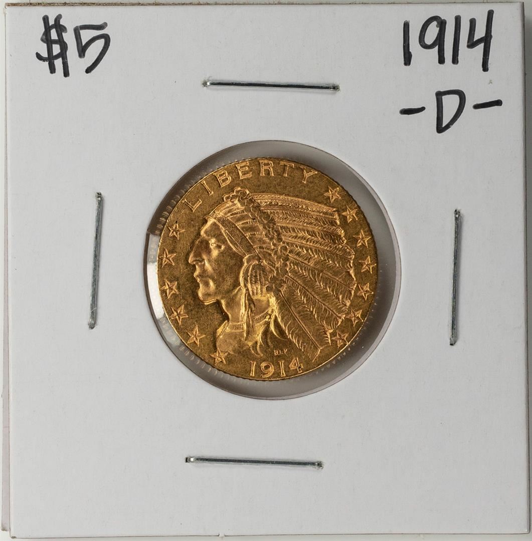 One 1914-D $5 Indian Head Half Eagle Gold Coin.