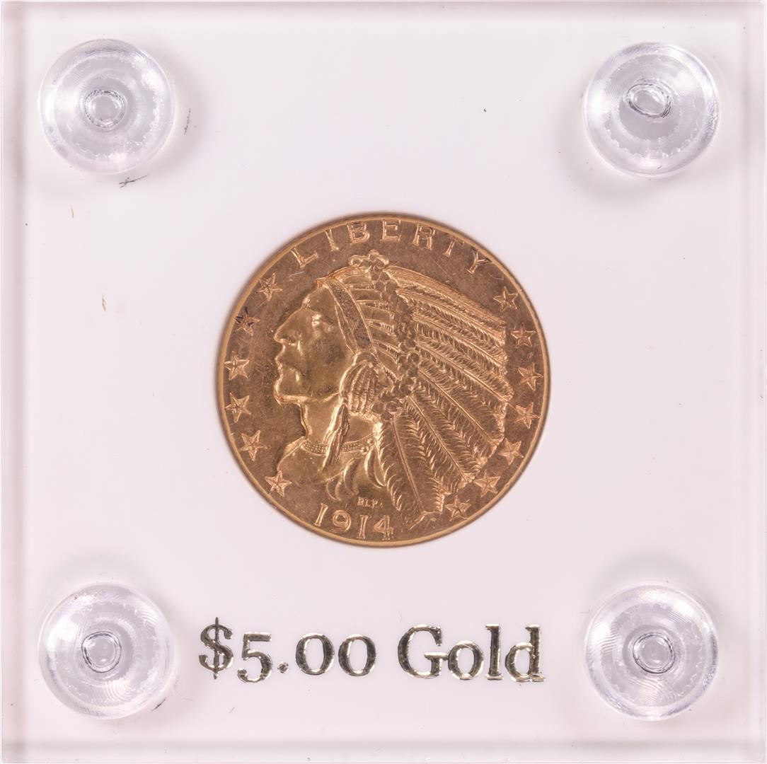 One 1914-D $5 Indian Head Half Eagle Gold Coin.