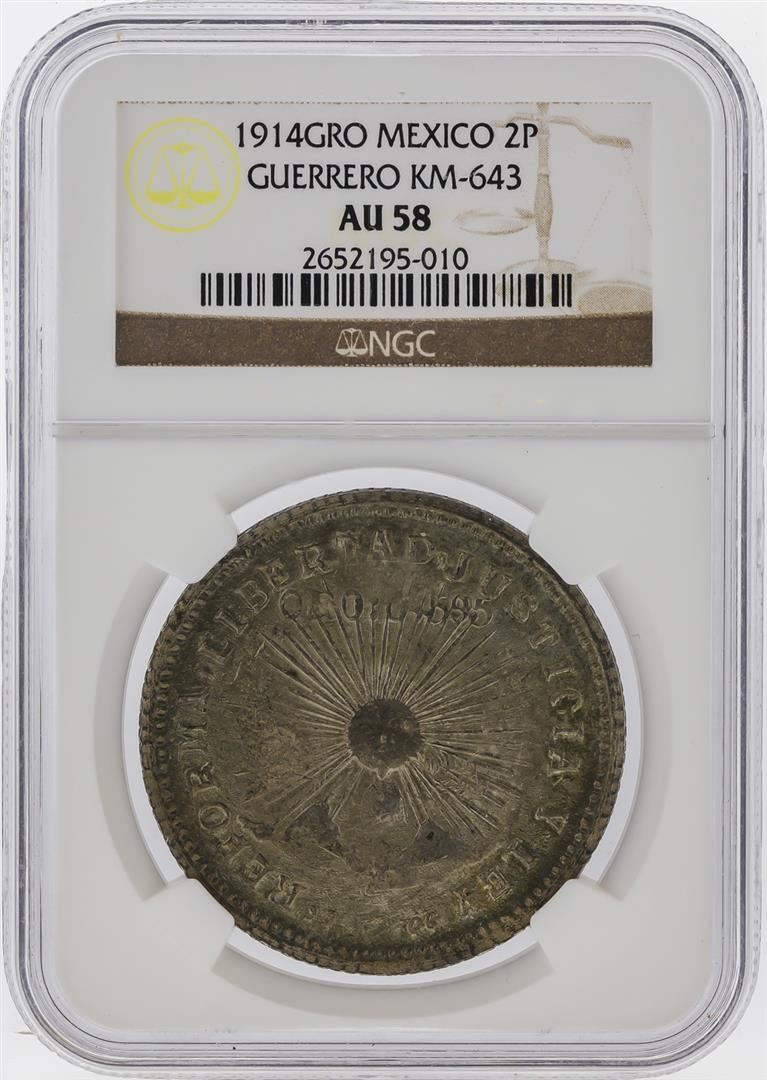 One 1914 Mexico Revolutionary 2 Pesos Guerrero Coin NGC AU58. NGC Certified.