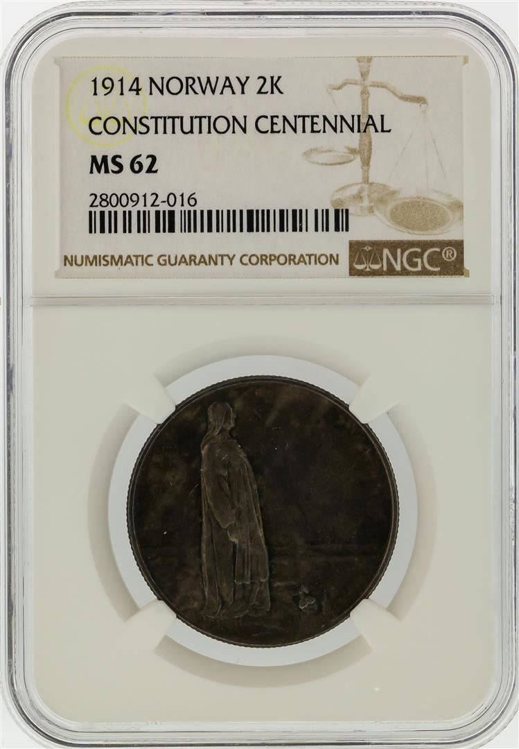 One 1914 Norway 2K Constitution Centennial Coin NGC Graded MS62. NGC Certified.