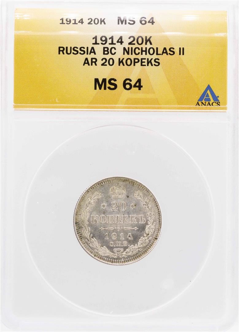 One 1914 Russia Bc Nicholas II AR 20 Kopeks Coin ANACS MS64. ANACS Certified.