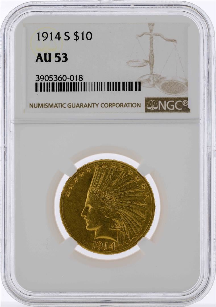 One 1914-S $10 Indian Head Eagle Gold Coin NGC AU53. NGC Certified.