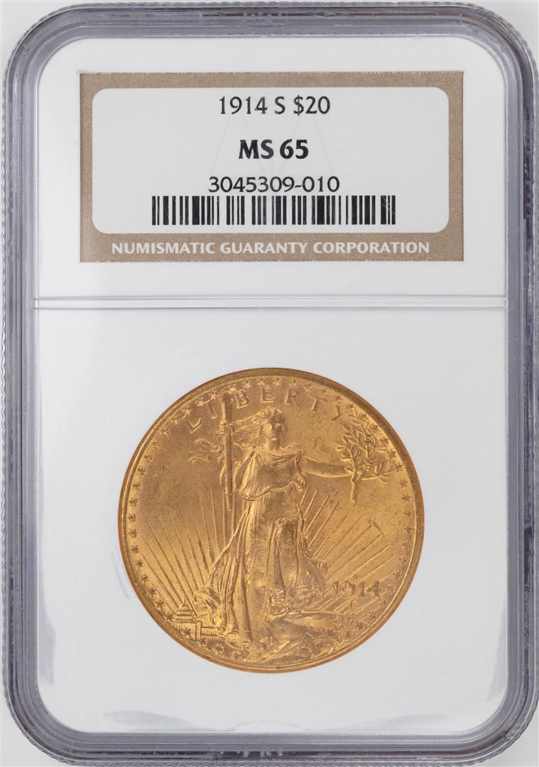 One 1914-S $20 St. Gaudens Double Eagle Gold Coin NGC MS65. NGC Certified.
