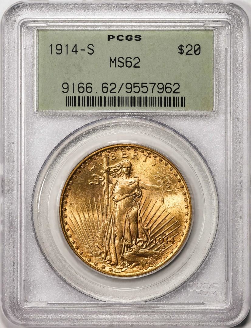 One 1914-S $20 St. Gaudens Double Eagle Gold Coin PCGS MS62 Old Green Holder. PCGS Graded.