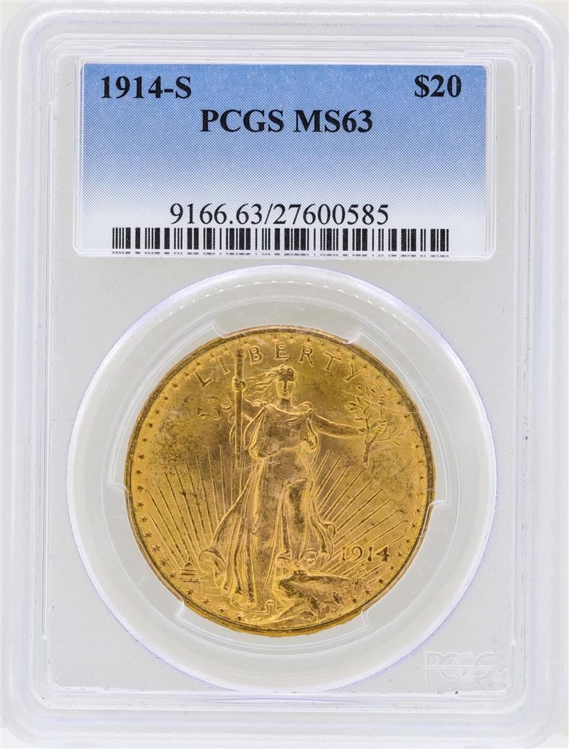 One 1914-S $20 St. Gaudens Double Eagle Gold Coin PCGS MS63. PCGS Graded.