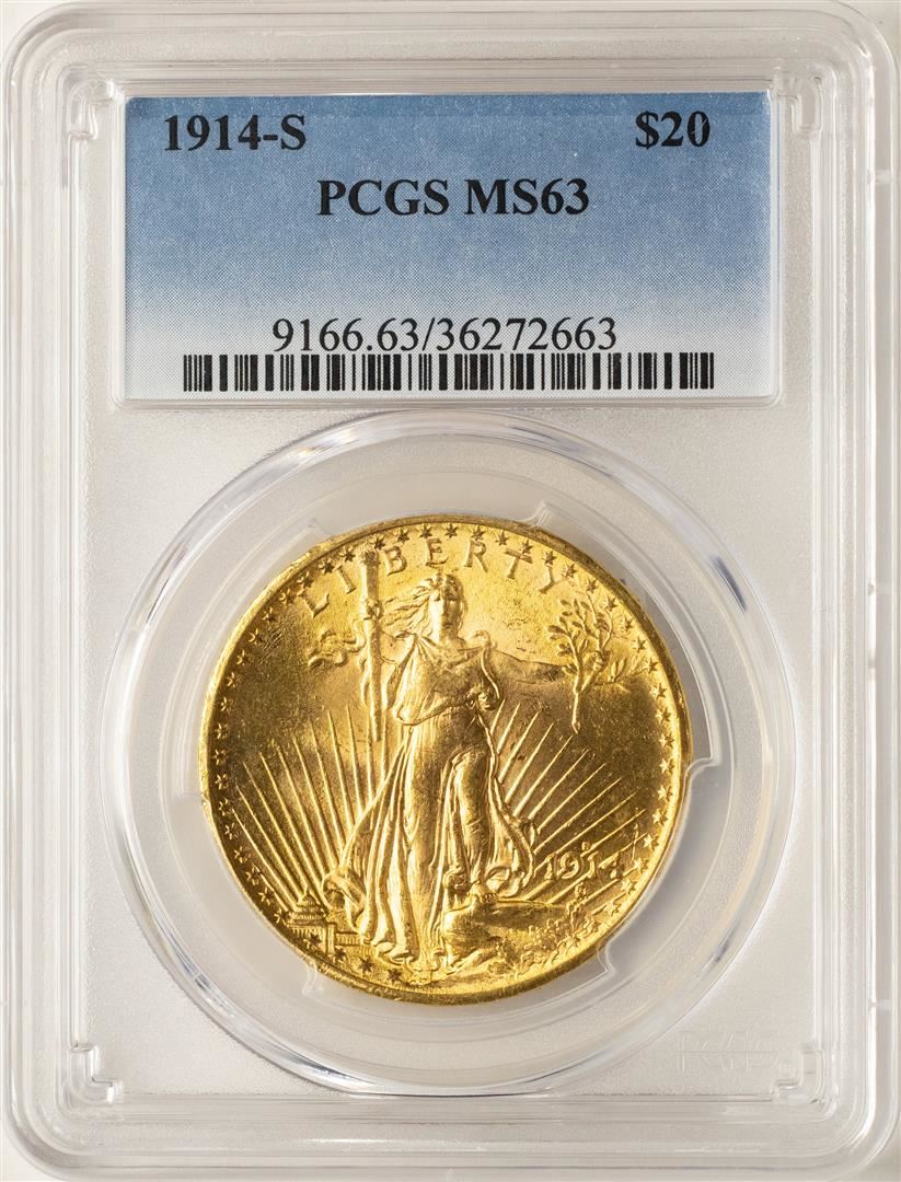 One 1914-S $20 St. Gaudens Double Eagle Gold Coin PCGS MS63. PCGS Graded.