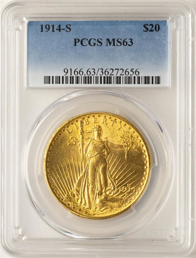 One 1914-S $20 St. Gaudens Double Eagle Gold Coin PCGS MS63. PCGS Graded.