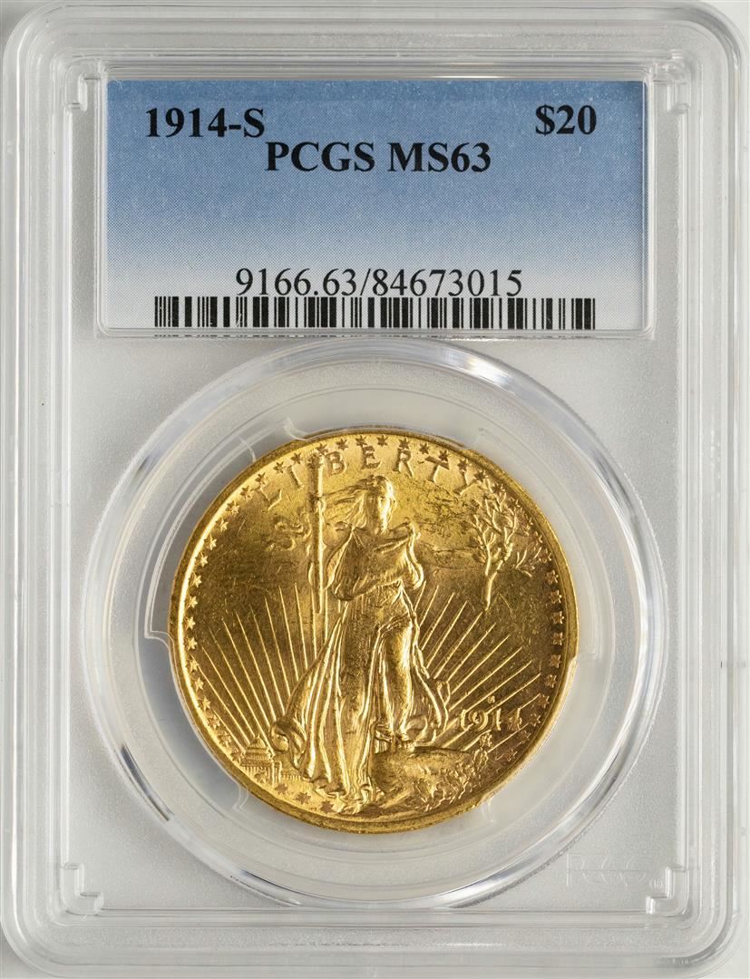 One 1914-S $20 St. Gaudens Double Eagle Gold Coin PCGS MS63. PCGS Graded.