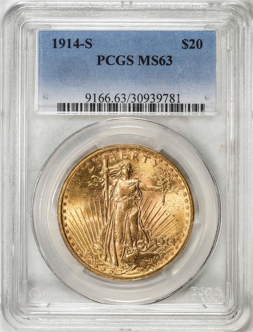 One 1914-S $20 St. Gaudens Double Eagle Gold Coin PCGS MS63. PCGS Graded.