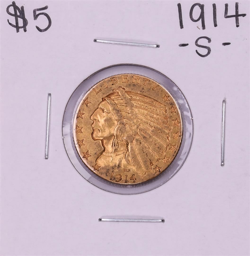 One 1914-S $5 Indian Head Half Eagle Gold Coin.