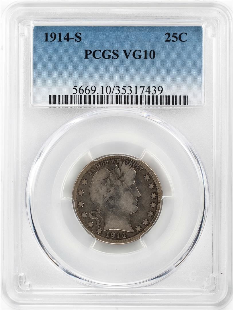 One 1914-S Barber Quarter Coin PCGS VG10. PCGS Graded.