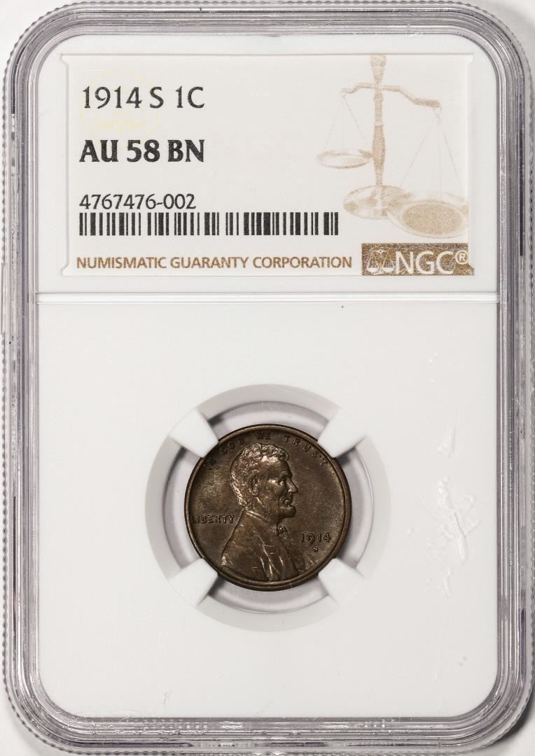 One 1914-S Lincoln Wheat Cent Coin NGC AU58BN. NGC Certified.