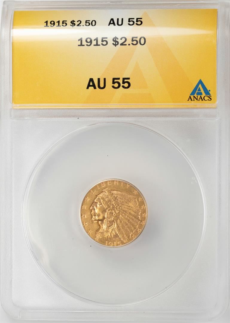 One 1915 $2 1/2 Indian Head Quarter Eagle Gold Coin ANACS AU55. ANACS Certified.