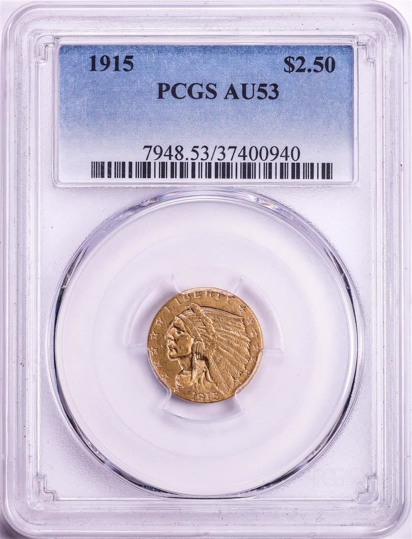 One 1915 $2 1/2 Indian Head Quarter Eagle Gold Coin PCGS AU53. PCGS Graded.