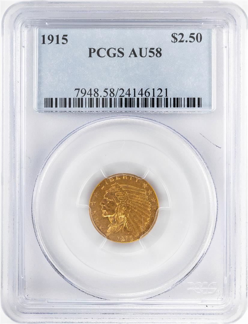 One 1915 $2 1/2 Indian Head Quarter Eagle Gold Coin PCGS AU58. PCGS Graded.