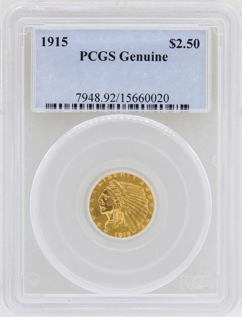 One 1915 $2 1/2 Indian Head Quarter Eagle Gold Coin PCGS Genuine. PCGS Graded.