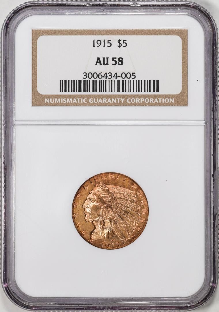 One 1915 $5 Indian Head Half Eagle Gold Coin NGC AU58. NGC Certified.