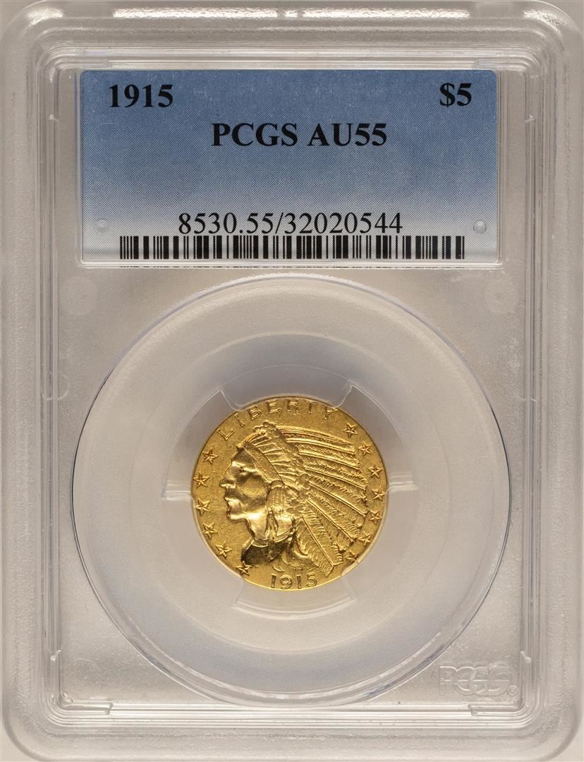 One 1915 $5 Indian Head Half Eagle Gold Coin PCGS AU55. PCGS Graded.