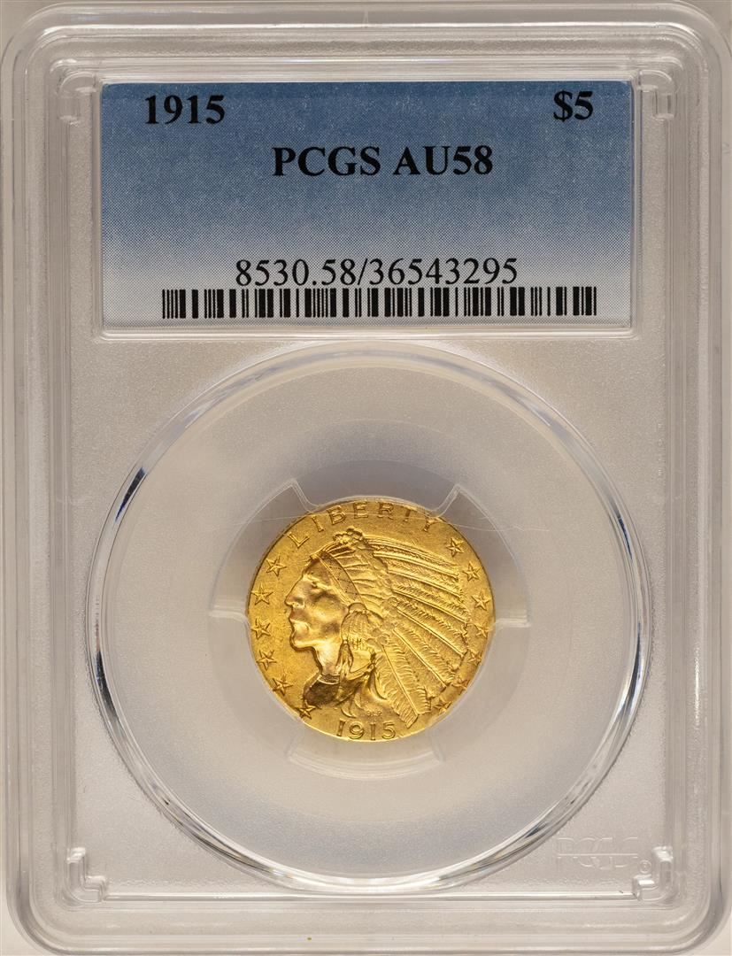One 1915 $5 Indian Head Half Eagle Gold Coin PCGS AU58. PCGS Graded.