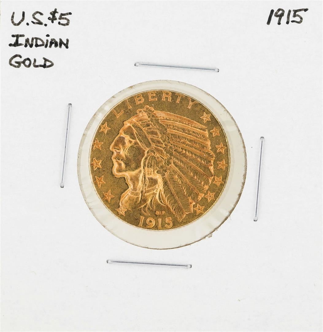 One 1915 $5 Indian Head Half Eagle Gold Coin.