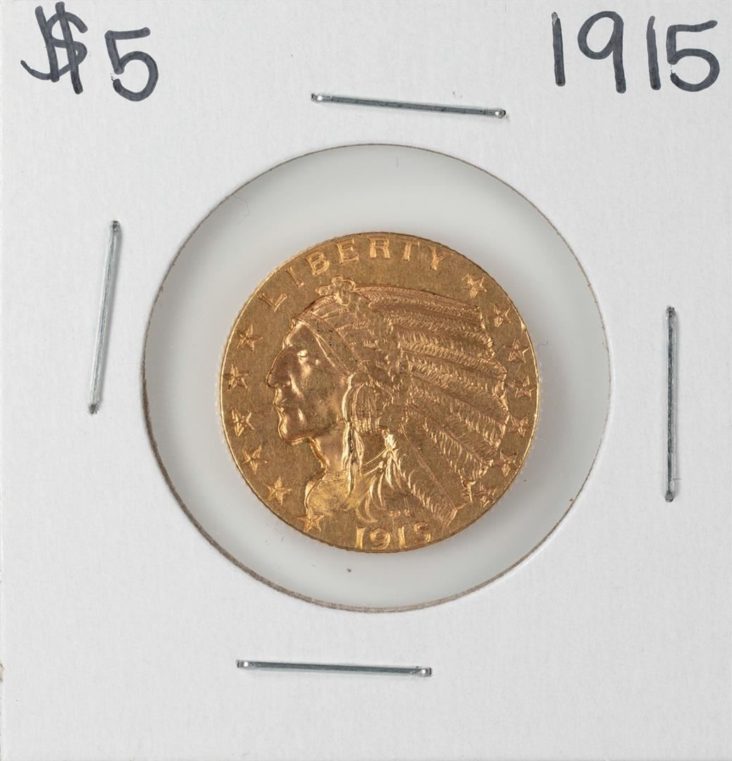 One 1915 $5 Indian Head Half Eagle Gold Coin.