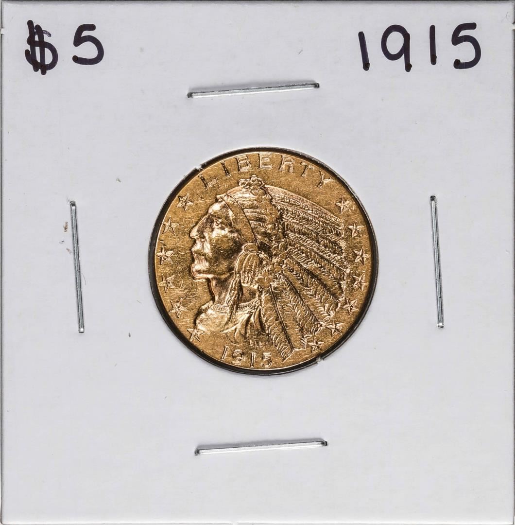 One 1915 $5 Indian Head Half Eagle Gold Coin.
