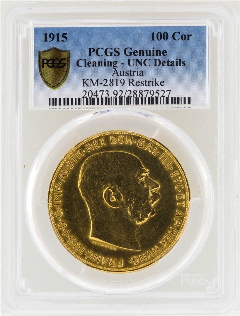 One 1915 Austria 100 Corona Gold Coin KM-2819 Restrike PCGS Genuine Unc Details. PCGS Graded.