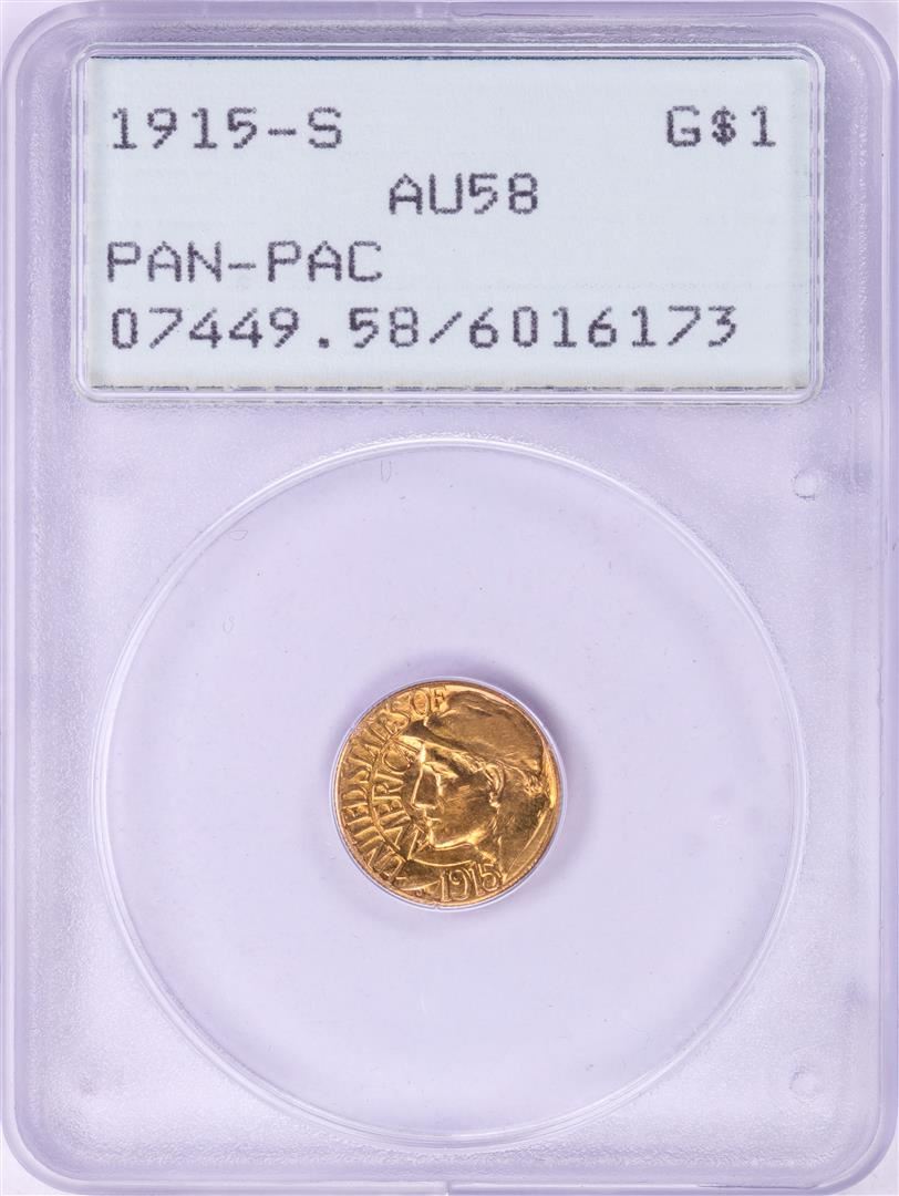 One 1915-S $1 Pan Pac Commemorative Gold Dollar Coin PCGS AU58 Green Rattler Holder. PCGS Graded.