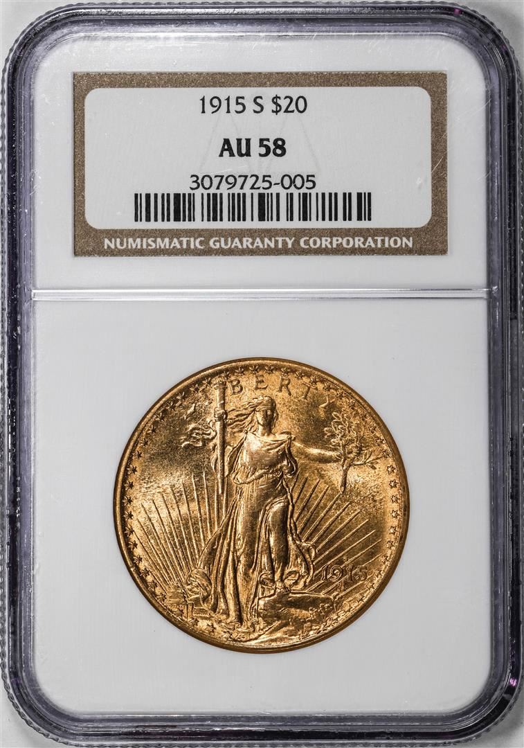 One 1915-S $20 St. Gaudens Double Eagle Gold Coin NGC AU58. NGC Certified.