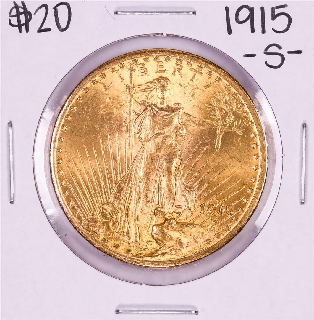 One 1915-S $20 St. Gaudens Double Eagle Gold Coin.
