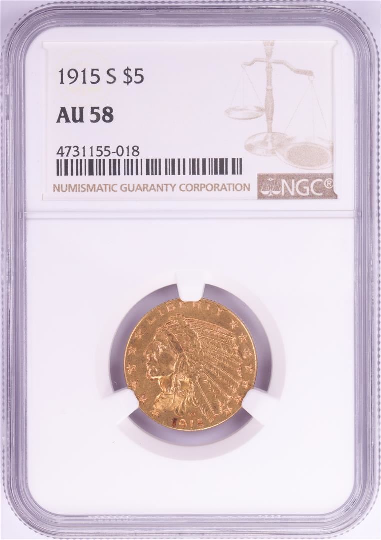 One 1915-S $5 Indian Head Half Eagle Gold Coin NGC AU58. NGC Certified.