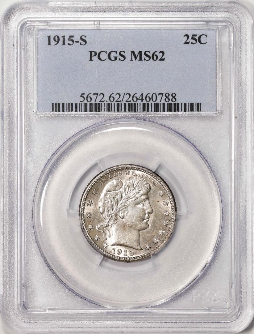 One 1915-S Barber Quarter Coin PCGS MS62. PCGS Graded.