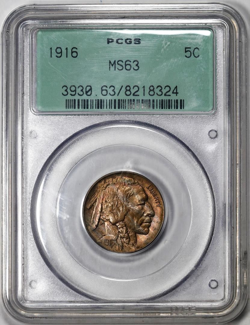 One 1916 Buffalo Nickel Coin PCGS MS63 Old Green Holder Amazing Toning. PCGS Graded.