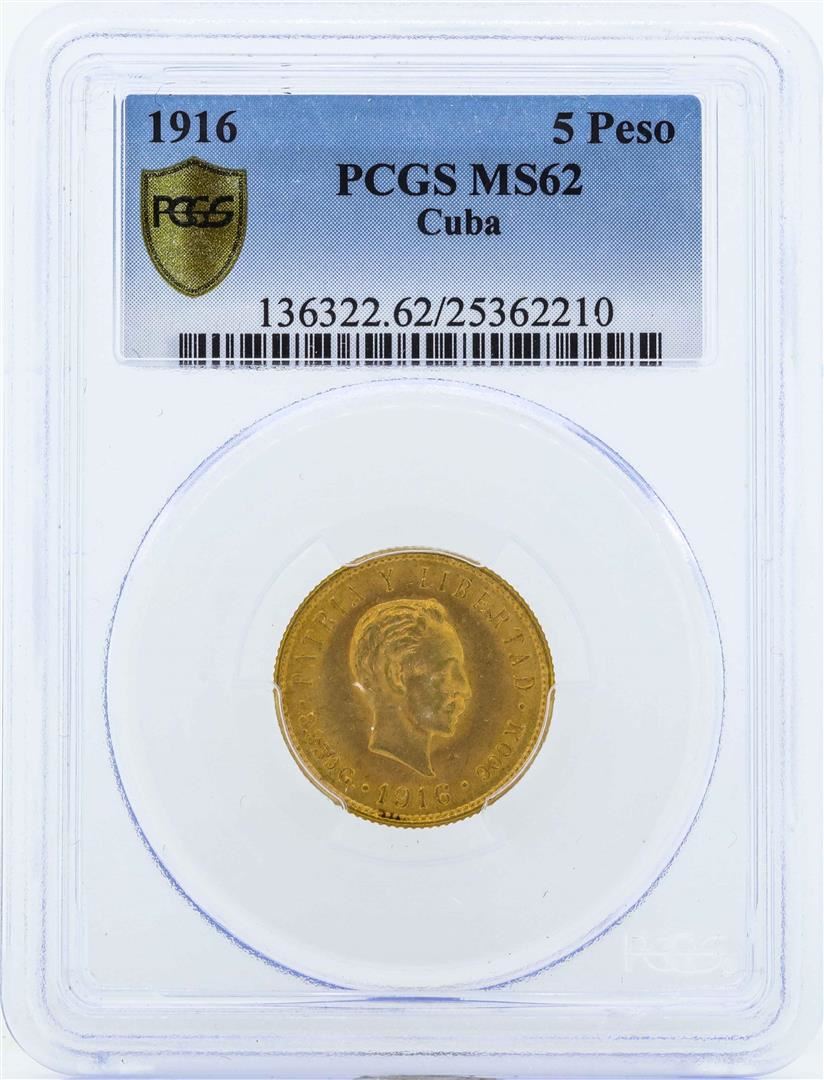 One 1916 Cuba 5 Pesos Gold Coin PCGS MS62. PCGS Graded.
