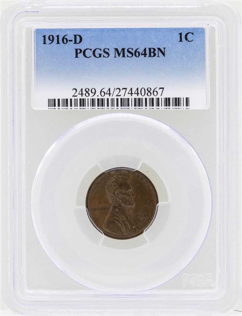 One 1916-D Lincoln Wheat Penny Coin PCGS MS64BN. PCGS Graded.