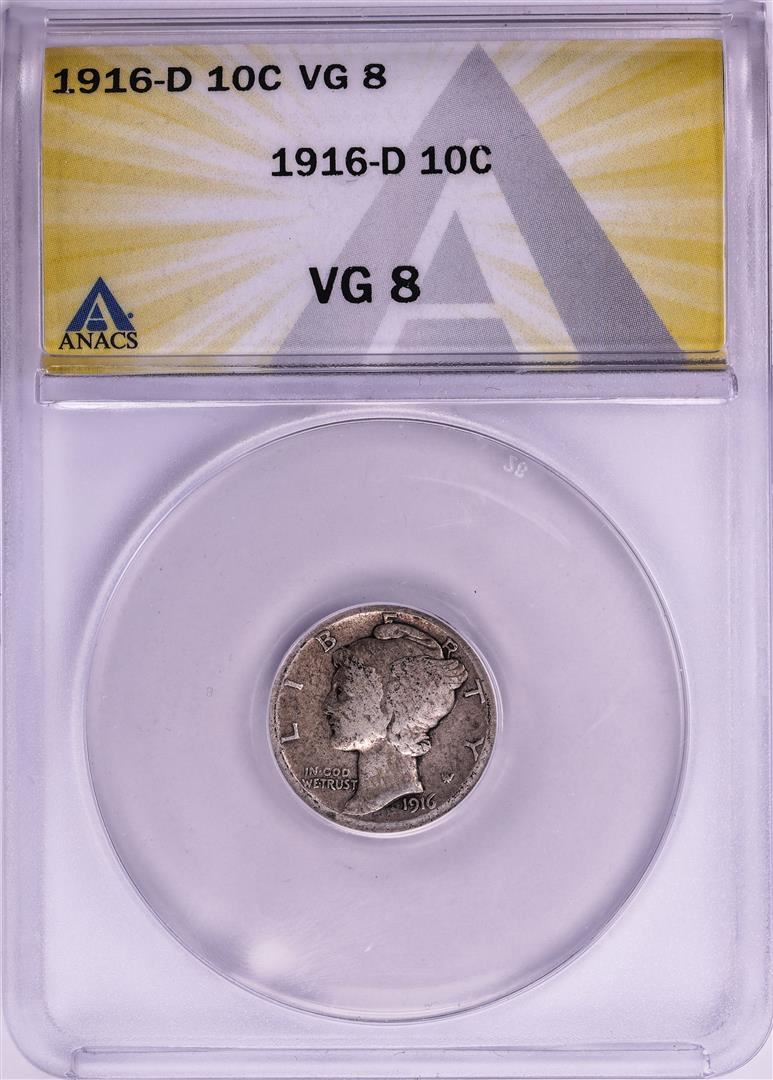 One 1916-D Mercury Dime Coin ANACS VG8. ANACS Certified.