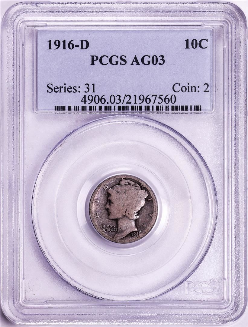 One 1916-D Mercury Dime Coin PCGS AG03. PCGS Graded.
