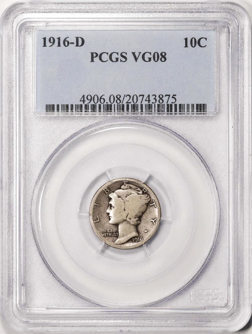 One 1916-D Mercury Dime Coin PCGS VG08. PCGS Graded.