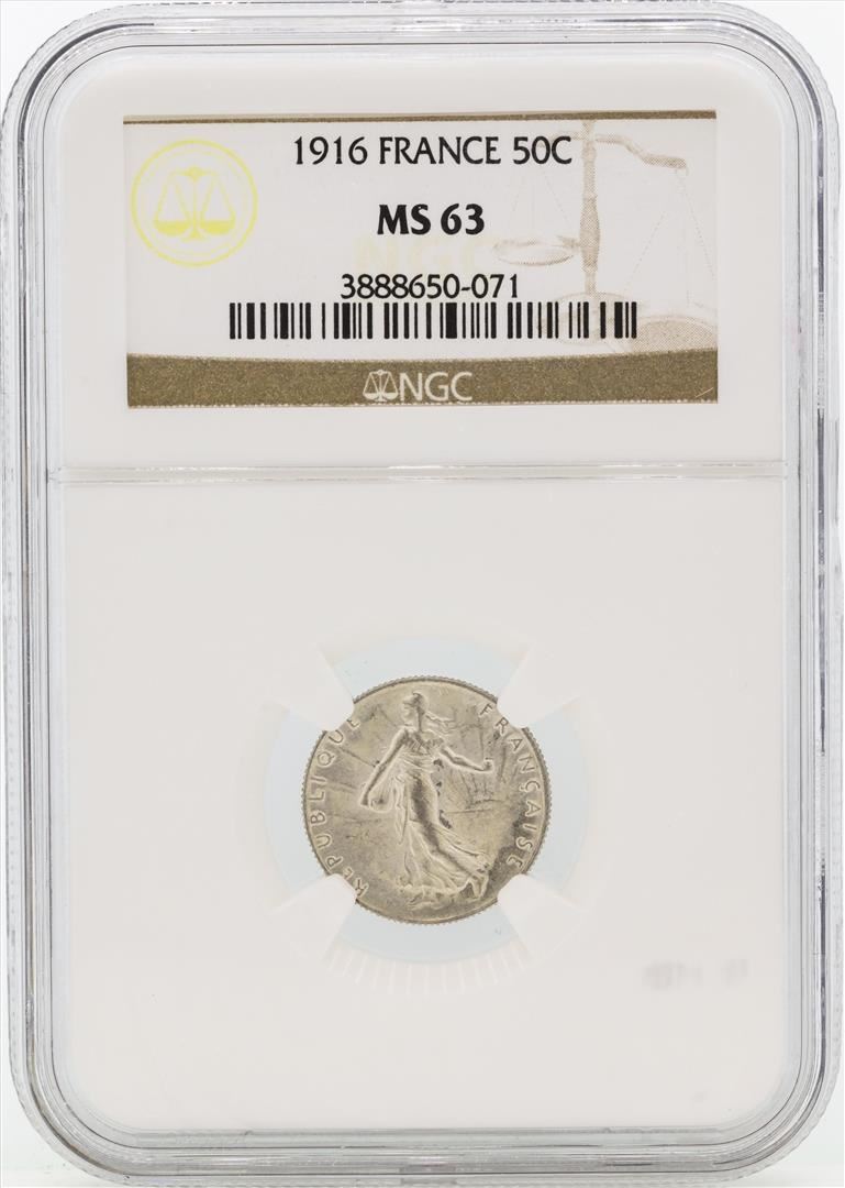 One 1916 France 50 Centimes Silver Coin NGC MS63. NGC Certified.