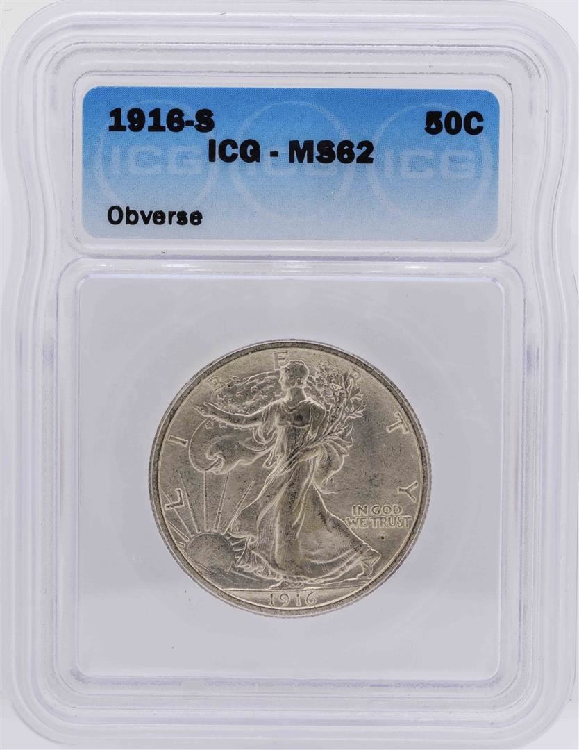 One 1916-S Walking Liberty Half Dollar Coin ICG MS62 Obverse.