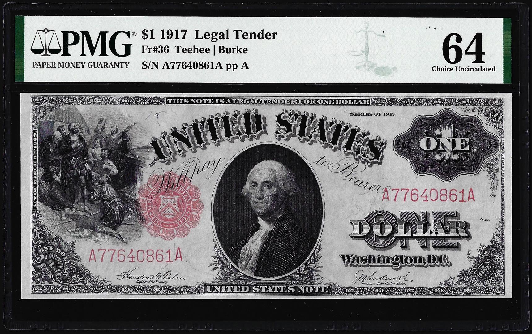One 1917 $1 Legal Tender Note Fr.36 PMG Choice Uncirculated 64. PMG Certified.