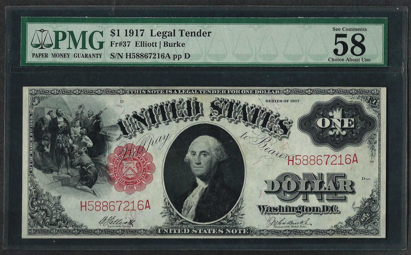 One 1917 $1 Legal Tender Note Fr.37 PMG Choice About Uncirculated 58EPQ. PMG Certified.